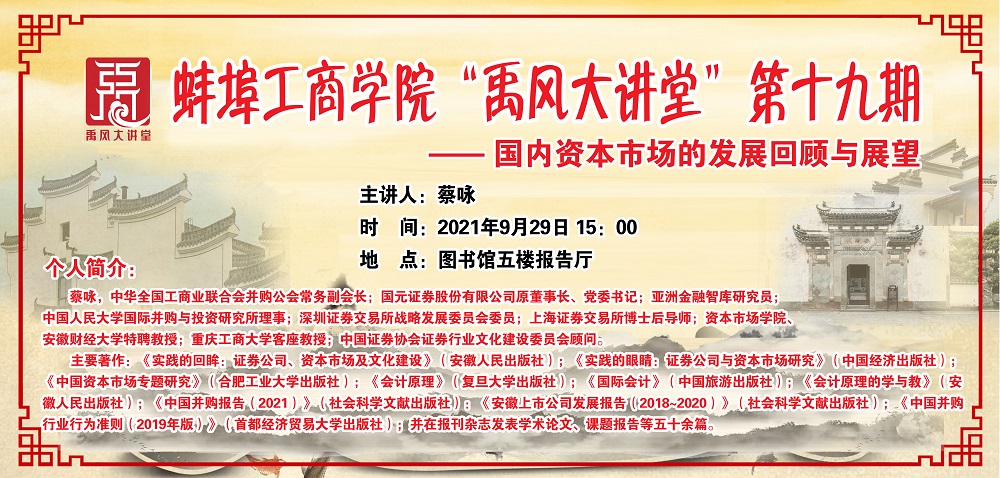 主讲人简介:蔡咏,中华全国工商业联合会并购公会常务副会长;国元证券股份有限公司原董事长、党委书记;亚洲金融智库研究员;中国人民大学国际并购与投资研究所理事;深圳证券交易所战略发展委员会委员;上海证券交易所博士后导师;资本市场学院、安徽财经大学特聘教授;重庆工商大学客座教授;中国证券协会证券行业文化建设委员会顾问。