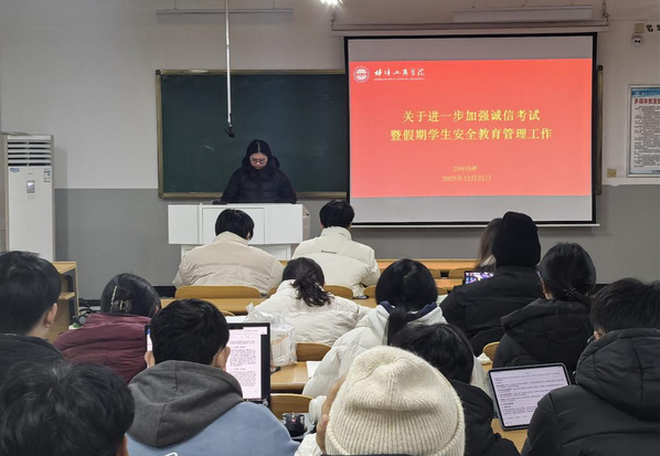 各学院积极响应、认真安排,以班级为单位,通过线下班会、线上宣传教育相结合的方式,实现了在校学生的全覆盖。在诚信考试教育环节,各班组织学生系统学习《学生手册》中关于考试违纪、作弊行为的认定标准与处分细则,结合近年来校内外典型案例开展警示教育,引导学生深刻认识诚信考试的重要性,自觉抵制违纪作弊行为,鼓励大家以真实水平展现学习成果,共同维护公平公正的考试环境。在假期安全教育环节,聚焦宿舍安全、出行安全、生活安全、防骗与法治安全等关键领域,开展多维度、针对性的安全知识普及与应急技能指导,帮助学生筑牢安全思想防线。此外,还就假期离校、返校统计等工作进行了安排,督促学生合理安排行程,为新学期教学秩序平稳衔接做好保障。