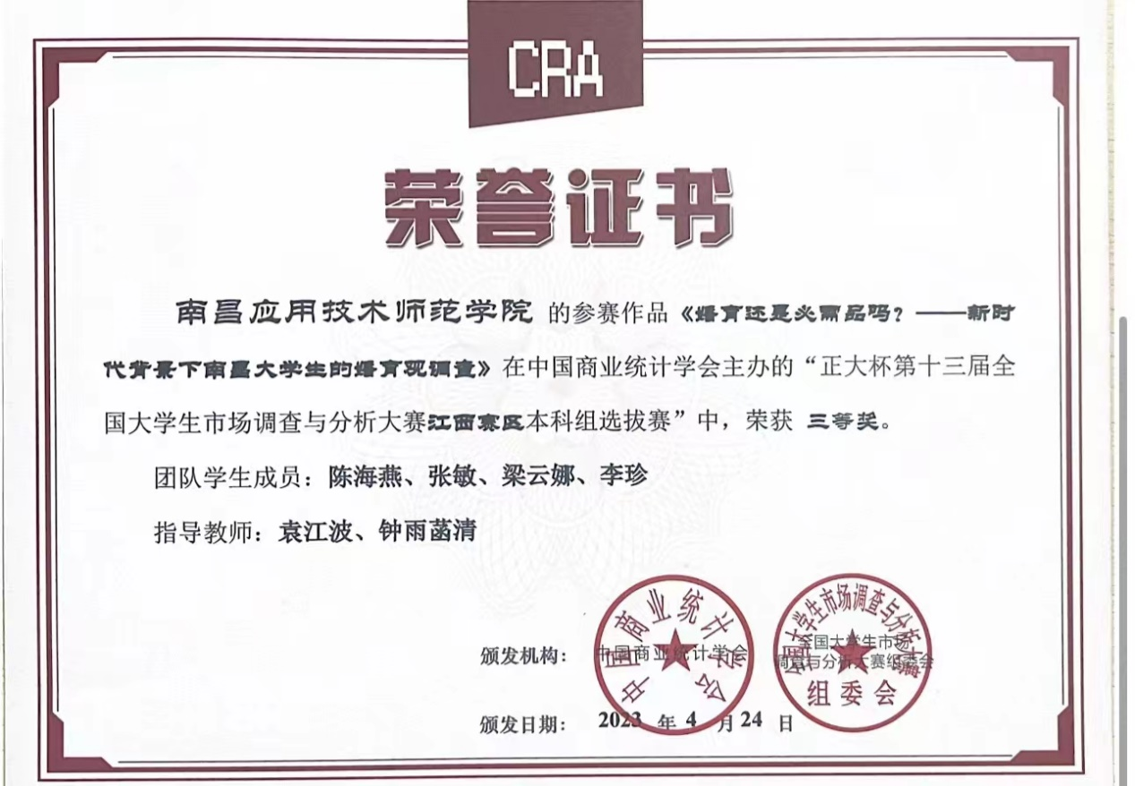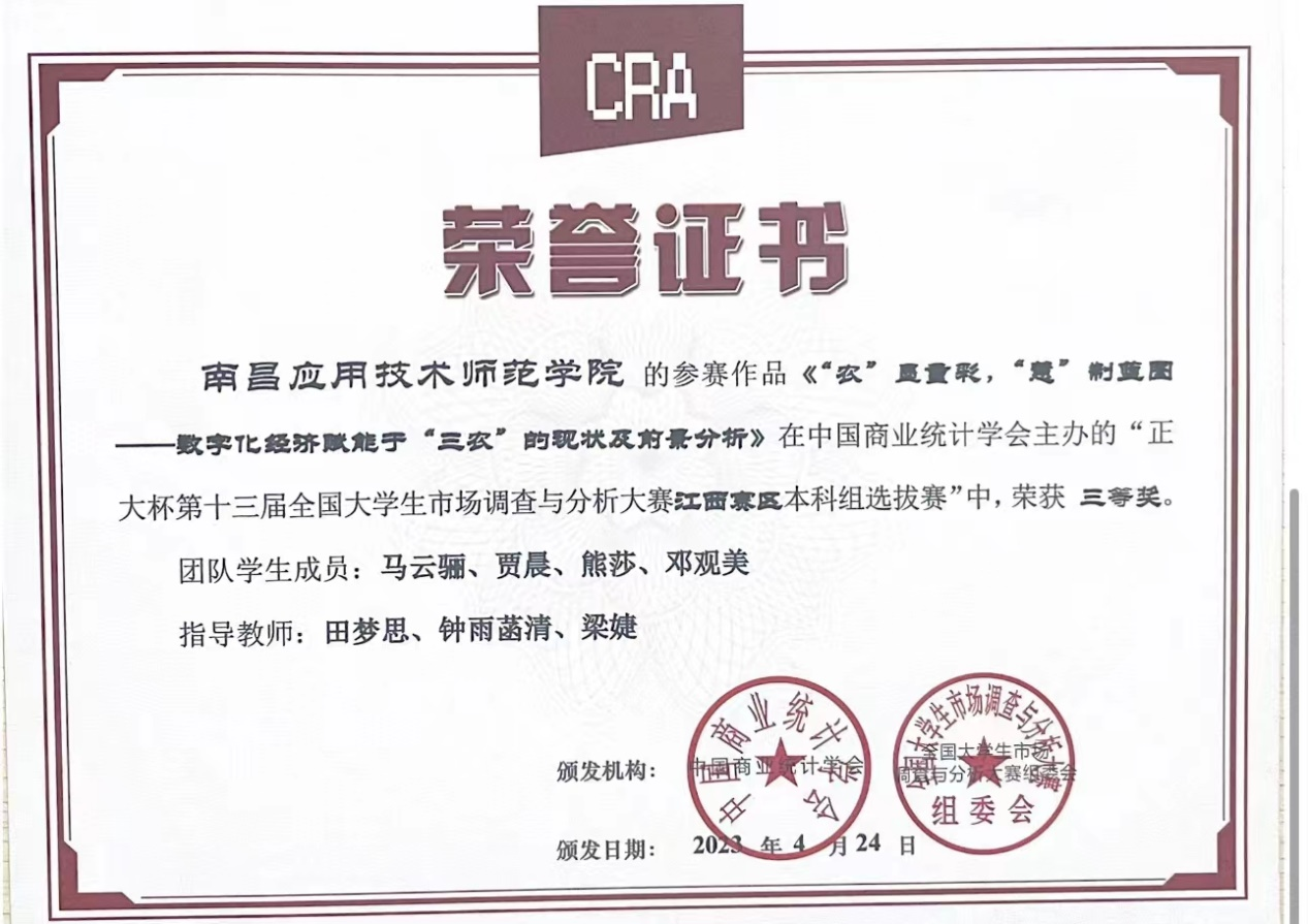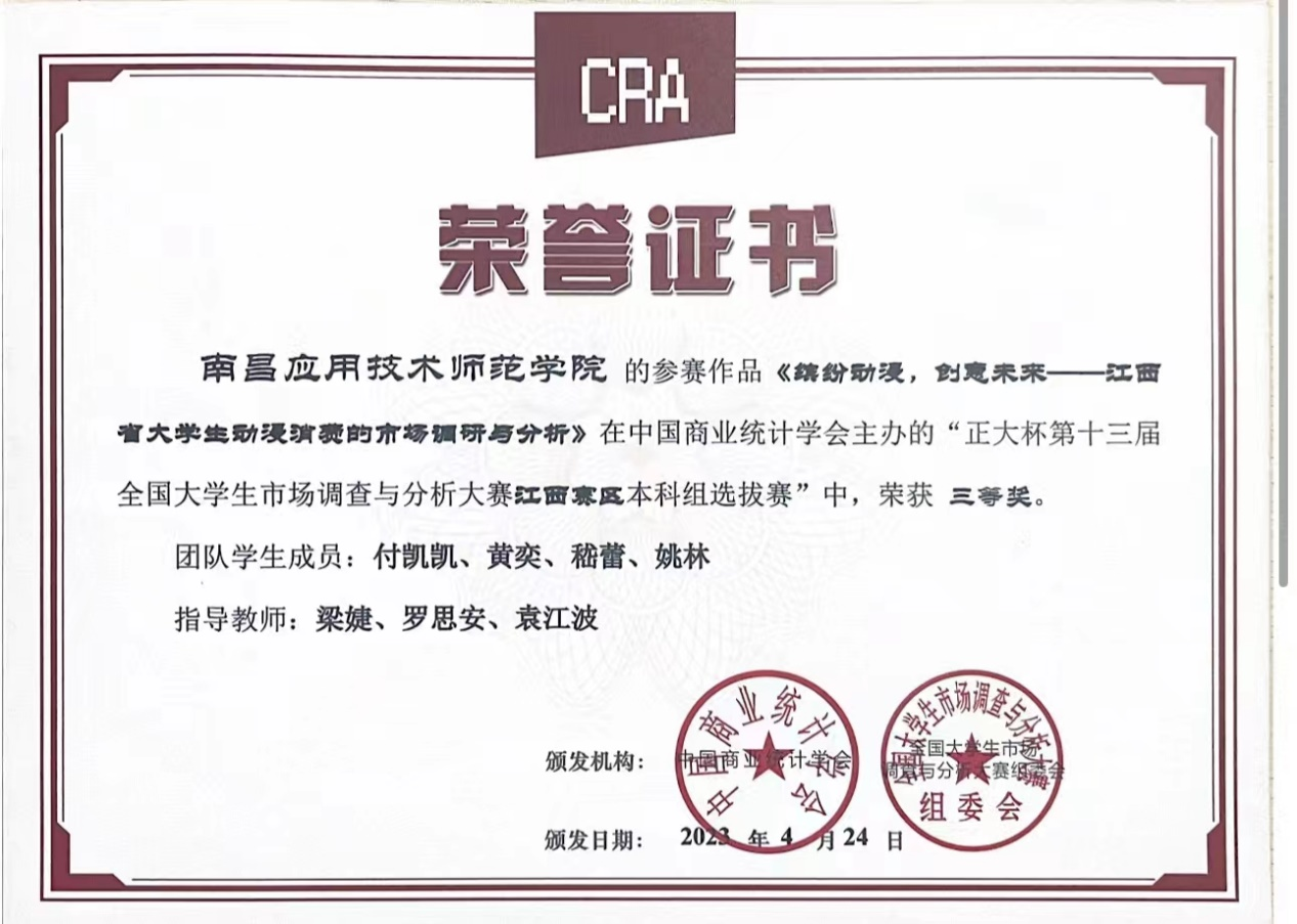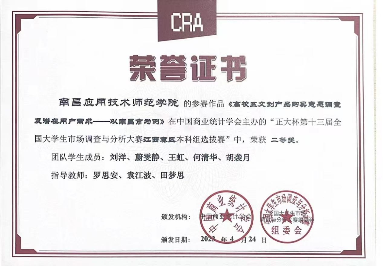 近日,由中国商业统计学会主办的“正大杯第十三届全国大学生市场调查与分析大赛”,江西赛区本科组已公布比赛结果,我校pg国际电子网站罗思安、袁江波、田梦思、梁婕和钟雨菡清老师指导的学生参赛作品获得比赛二等奖1项,三等奖3项。