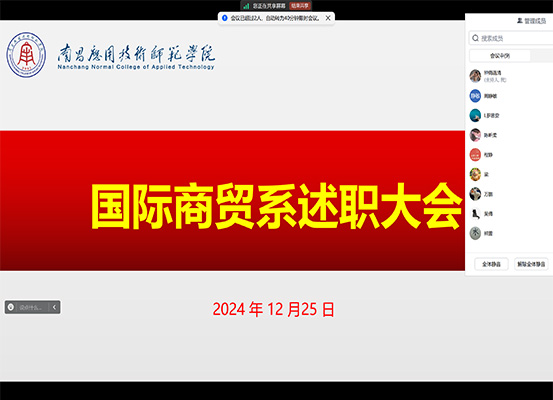 2024年12月25日晚8点,国际商贸系通过腾讯会议的方式,召开了2024年述职大会。国际商贸系的9位教师参加了此次会议,共同对过去一年的工作进行了全面回顾与总结。